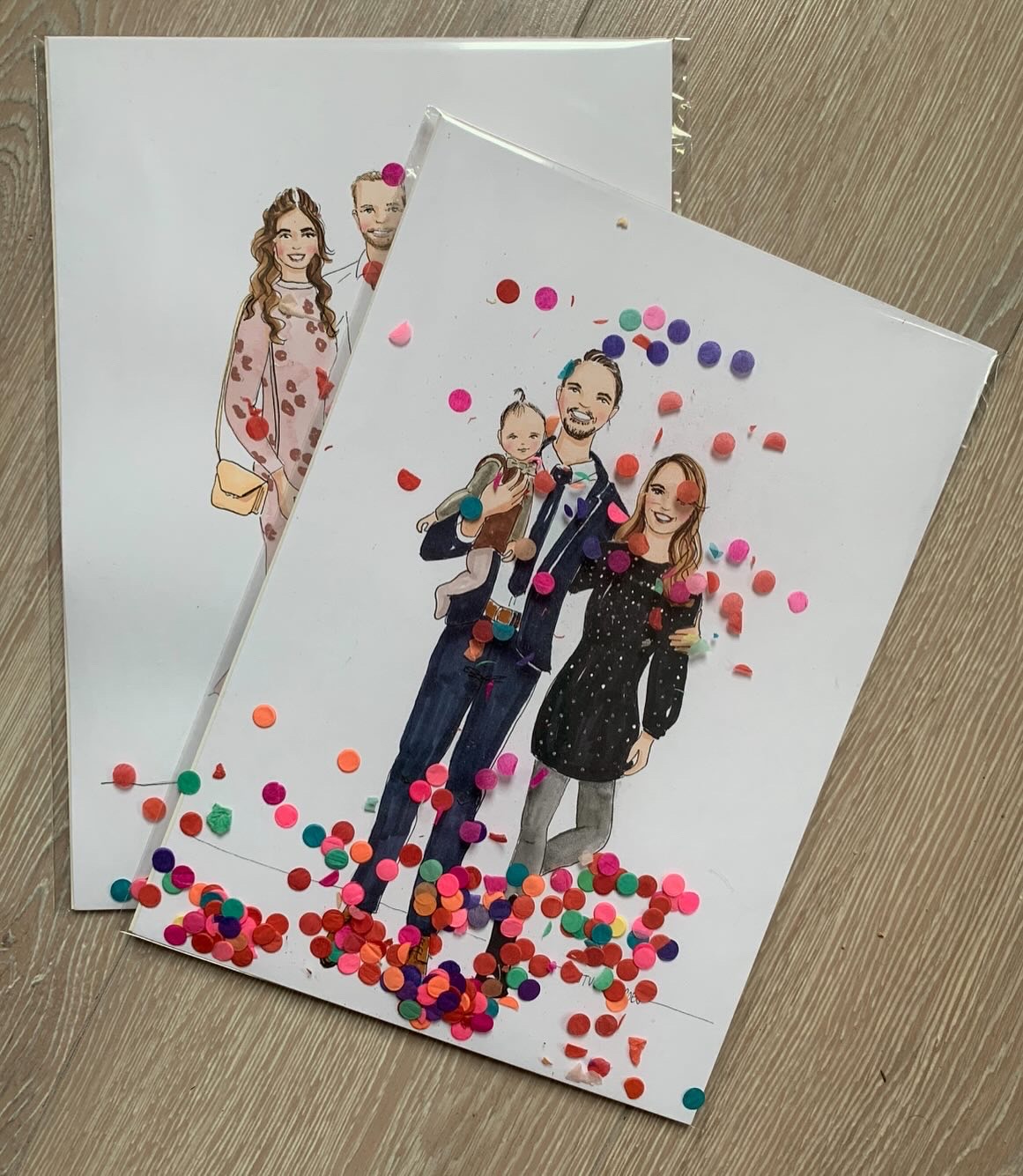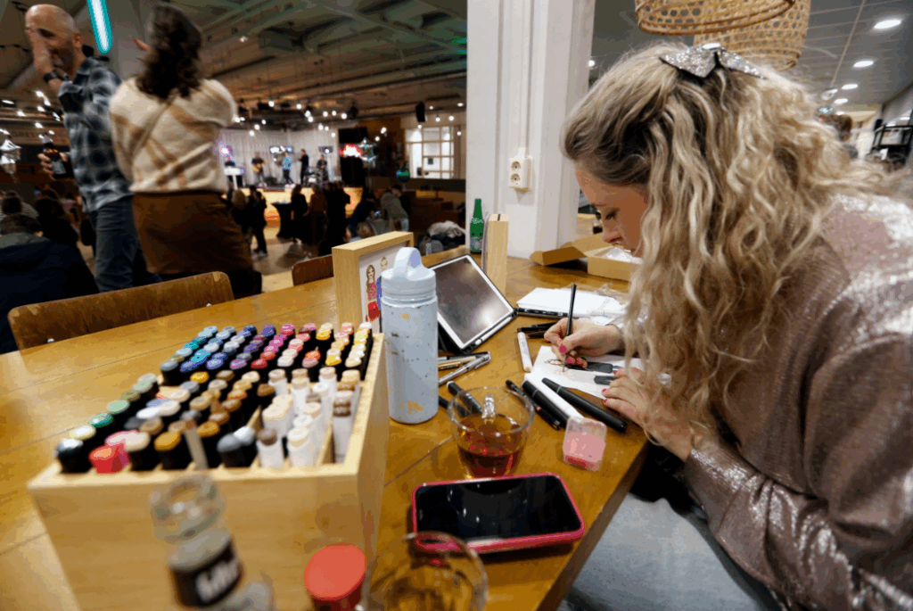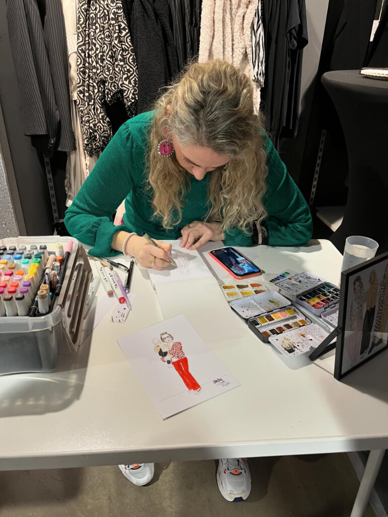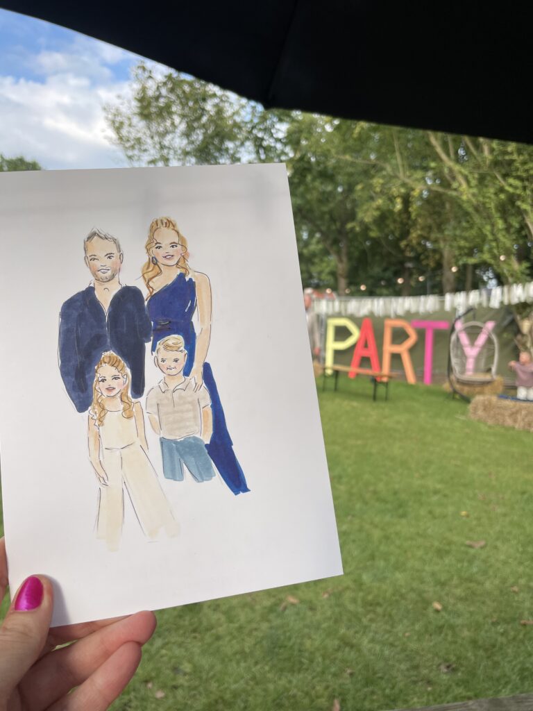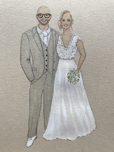 Op de dag zelf maak ik snel foto’s van de gasten, waarna ik aan de slag ga met de portretjes terwijl zij niks van de bruiloft hoeven te missen. Vaak werk ik met een VIP-lijst, samengesteld door het bruidspaar zodat ik weet welke mensen sowieso getekend moeten worden. Ik teken op A5-papier en gebruik waterverf, markers, fineliners en potlood voor mijn illustraties. Ik zorg er bovendien voor dat de portretjes mooi verpakt aan de gasten gegeven kunnen worden. Uiteraard ontvangt het bruidspaar ook een portret.