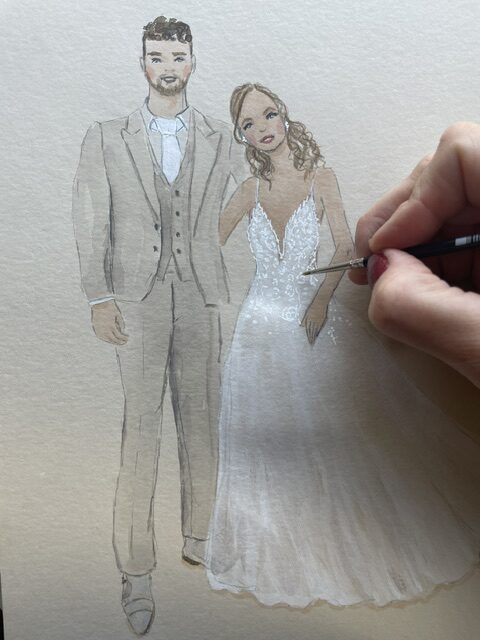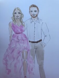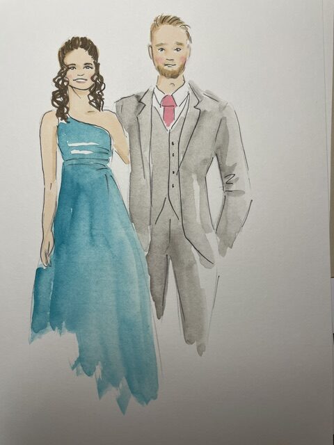 De kosten voor live illustraties varieert van de tijd dat ik aanwezig ben op jullie bruiloft. Per persoon ben ik ongeveer 7 minuten bezig, waardoor ik gemiddeld tot 8 mensen per uur kan tekenen. Outfits met meer detail zoa